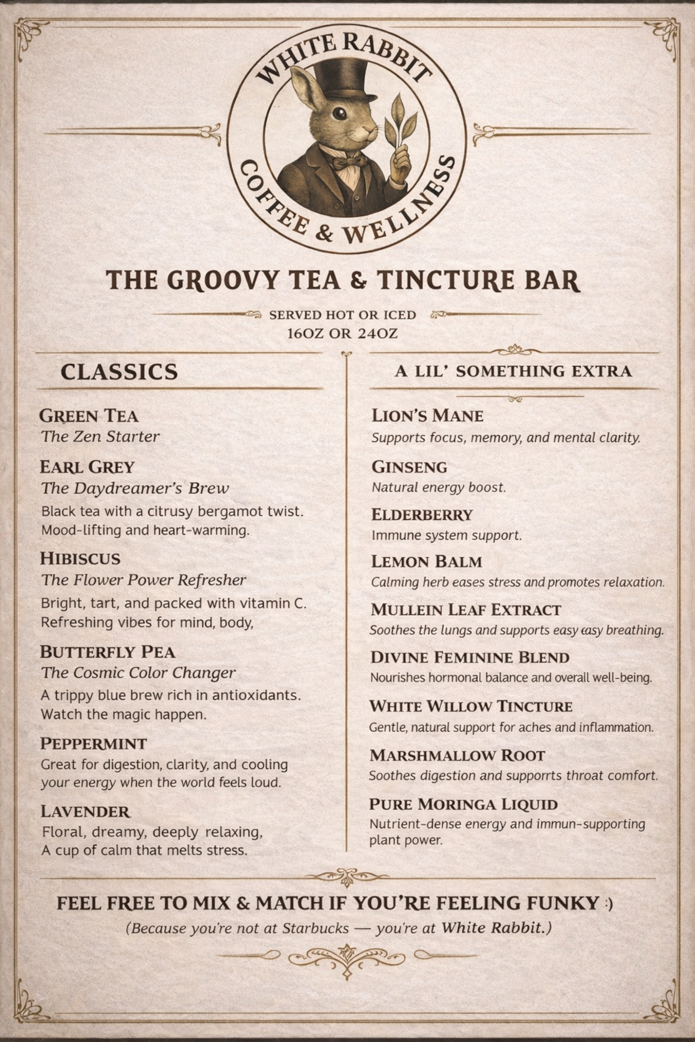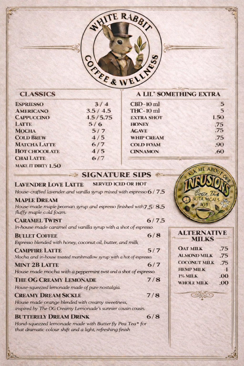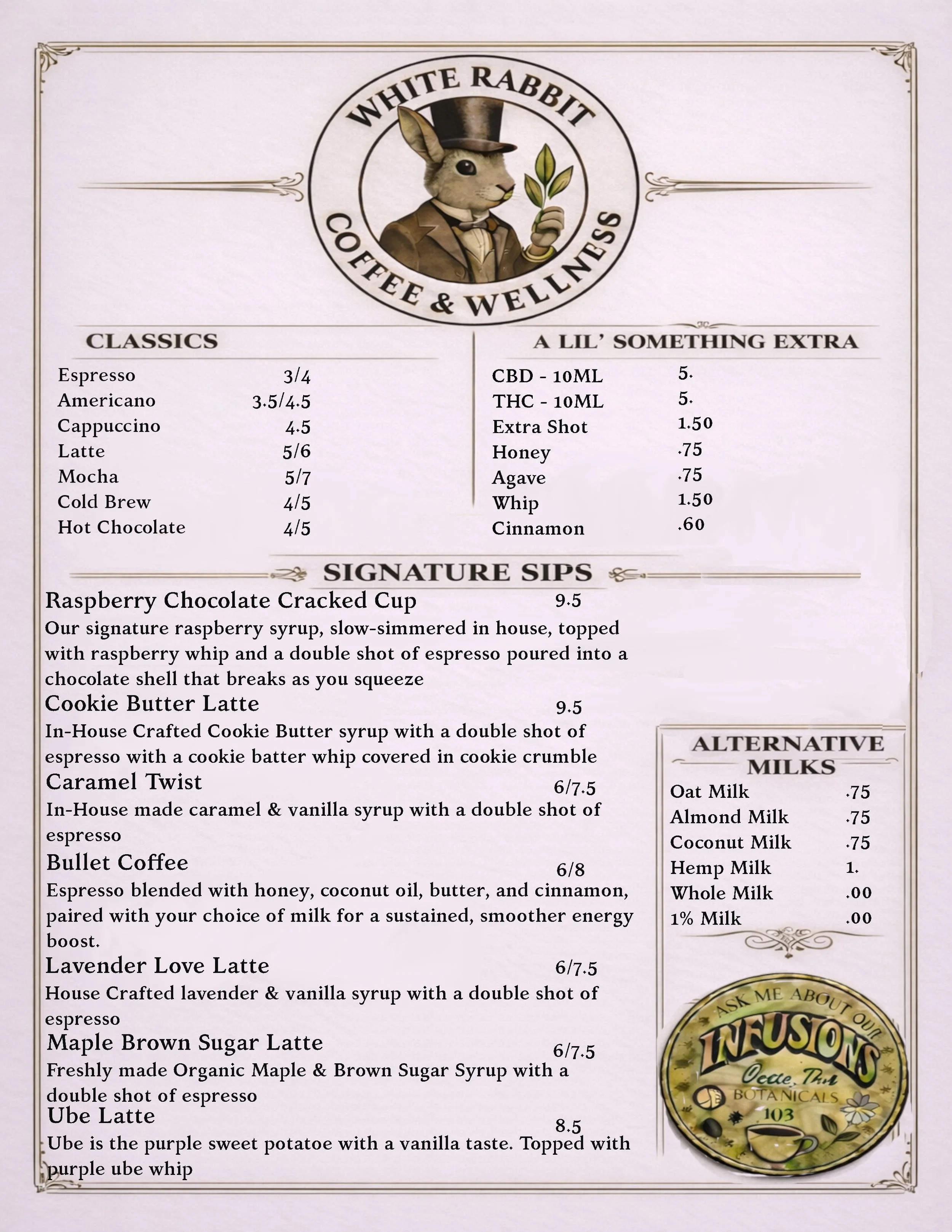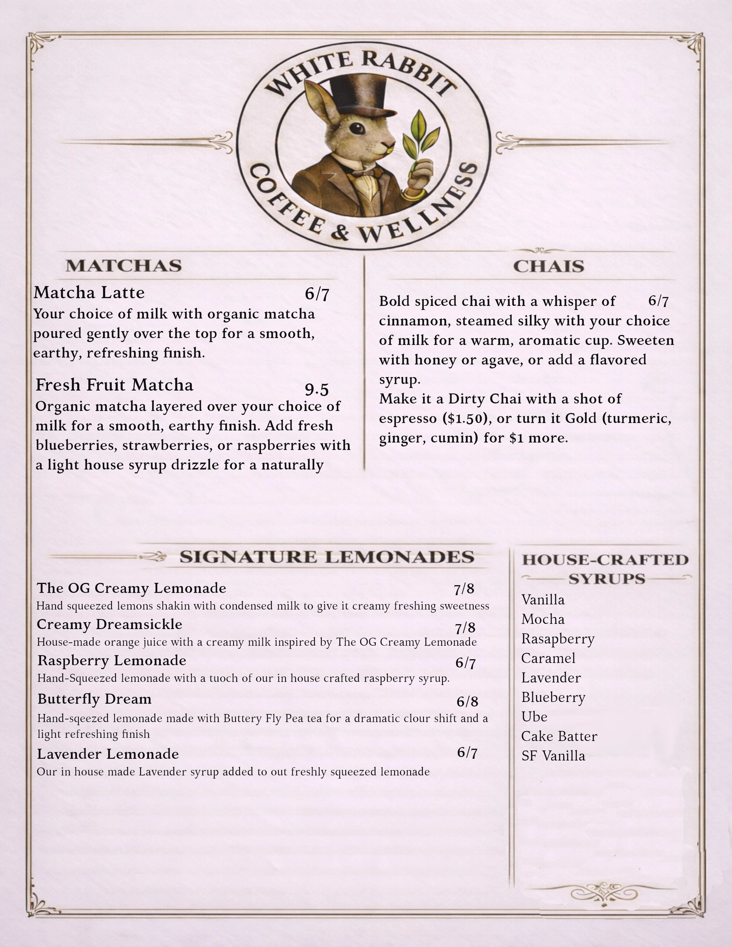 A plastic cup with a lid and straw containing a creamy iced beverage with ice cubes, sitting on a white table. The cup has a logo with a rabbit wearing a hat and the text "White Rabbit Coffee & Wellness."
